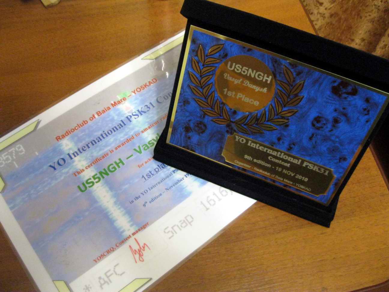 Для радіоаматорів, котрі вирішать вперше спробувати себе в цифрових контестах, одна із найкращих нагод - YO PSK-31 contest. Дійсно, не високий темп, лише один діапазон, відсутність турів. Особисто для мене, у 2009 році - це друге змагання в житті та перше цифровими видами. Також брав участь у ньому в 2010 році. І от, не пройшло і два рочки, як 10 днів тому отримав ось це за ось це. Організатори вибачилися за річну затримку, минулорічному переможцю нагороду та диплом вислали одночасно із моїми. Із наших у минулому році брав участь UT3N(K) та посів 6-те місце. Положення на 2012 рік тут. 73! UT0NN
